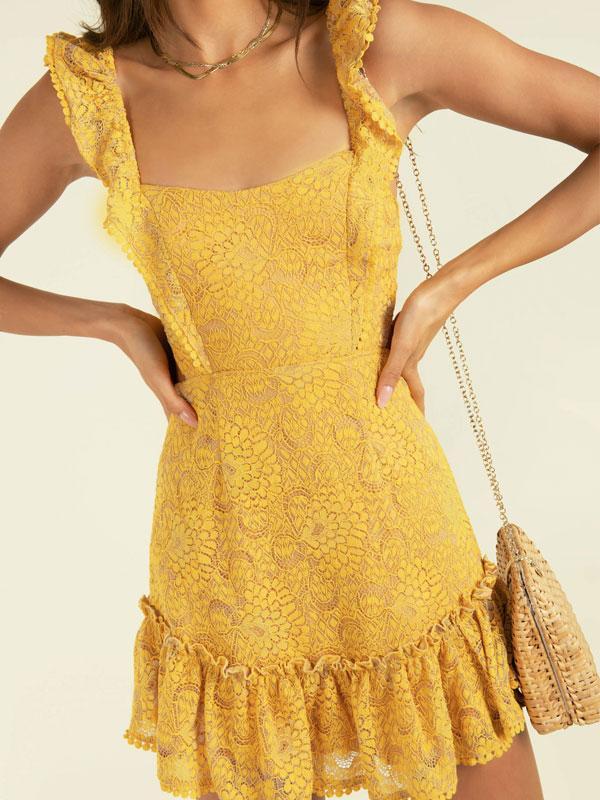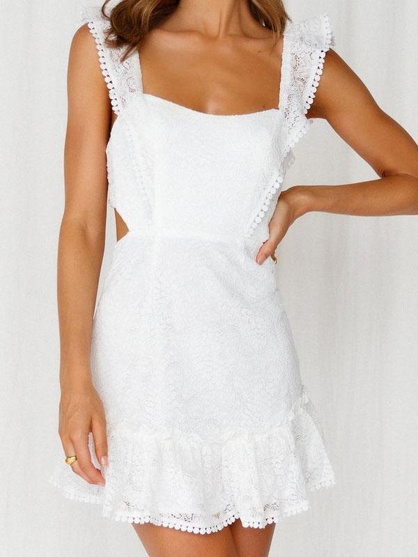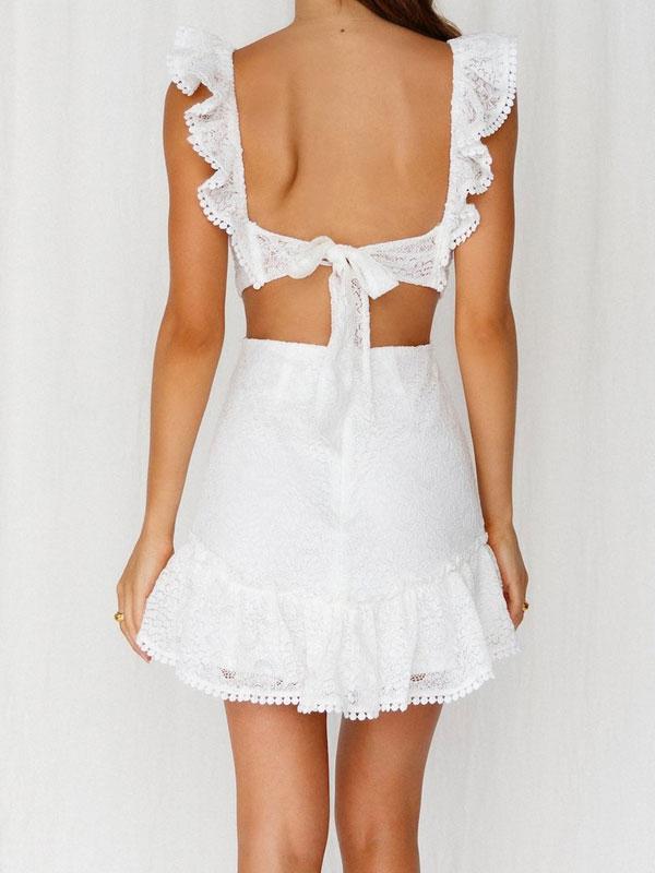Feel beautiful in our stunning mini Dress. This gorgeous mini is made from a white lace fabric and features ruffle shoulder straps and an open back with a lovely tie-up detail. Style her with gold accessories and strappy heels for your next special occasion!